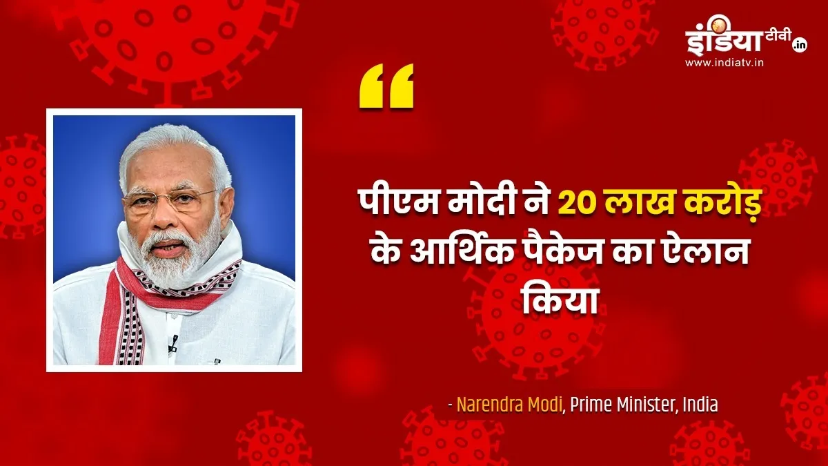 नई दिल्ली। कोरोना संकट से अर्थव्यवस्था को उबारने के लिए प्रधानमंत्री नरेंद्र मोदी ने मंगलवार (12 मई) रात 8 बजे अपने देश के नाम संबोधन में विशेष आर्थिक पैकेज की घोषणा की है। प्रधानमंत्री ने कहा है कि इस संकट से निपटने के लिए सरकार और आरबीआई ने अबतक जो रहात पैकेज दिए हैं और आगे जो राहत पैकेज मिलने वाले हैं उन सबको मिला लिया जाए तो लगभग 20 लाख करोड़ की राशि बनती है, जो देश की अर्थव्यवस्था का लगभग 10 प्रतिशत है।
