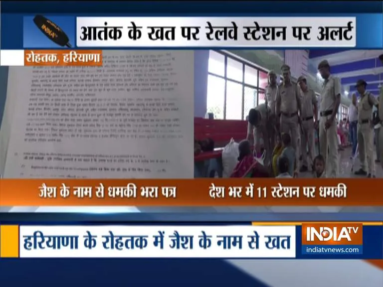 जैश के नाम से लिखे इस पत्र में रोहतक जंक्शन, रेवाड़ी, हिसार, कुरुक्षेत्र, मुंबई सिटी, बंगलुरू, चेन्नई, जयपुर, भोपाल, कोटा, इटारसी रेलवे स्टेशनों को उड़ाने की धमकी दी गई है। वहीं राजस्थान, गुजरात, तमिलनाडु, एमपी, यूपी और हरियाणा के मंदिरों को निशाना बनाने की धमकी दी गई है।