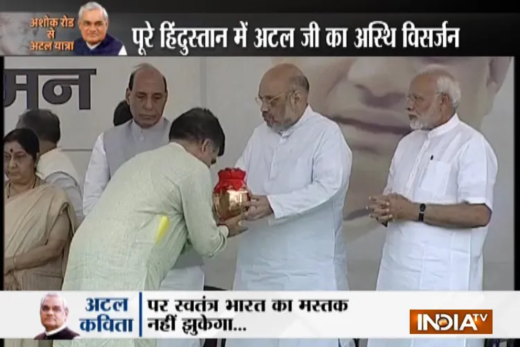 नई दिल्ली: हिंदुस्तान की राजनीति के भीष्म पितामह अटल बिहारी वाजपेयी इस धरती से भले ही विदा हो गए लेकिन यादों में वो हमेशा हर हिंदुस्तानी के जेहन में जिंदा रहेंगे। उनकी ओजपूर्ण वाणी, उनके फैसले, उनकी नेतृत्व सदियों तक भारत के इतिहास की अमिट यादों में रहेगा। आज अटल जी की अस्थि कलश यात्रा दिल्ली से हिंदुस्तान के कोने-कोने तक जा रही है। प्रधानमंत्री नरेंद्र मोदी और अमित शाह सभी राज्यों और केंद्रशासित प्रदेशों के बीजेपी अध्यक्षों को अटल जी के 36 अस्थि कलश सौंपे। खास बात ये है कि आज का ये कार्यक्रम दिल्ली के 11, अशोक रोड पर बीजेपी के पुराने मुख्यालय पर हुआ, वो जगह जो कभी अटल जी का कर्मक्षेत्र था।