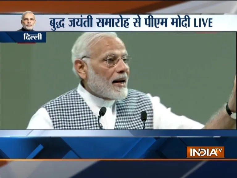 बुद्ध जयंती समारोह पर प्रधानमंत्री मोदी दिल्ली में अपनी बात रख रहे हैं।