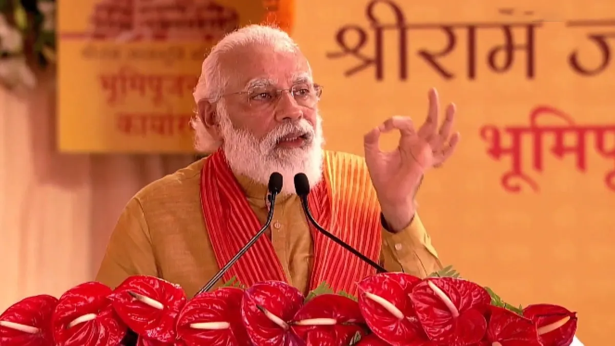 नई दिल्ली। प्रधानमंत्री नरेंद्र मोदी ने बुधवार (5 अगस्त) को अयोध्या में राम मंदिर भूमि पूजन कार्यक्रम के बाद देशवासियों को संबोधित किया। पीएम मोदी ने अयोध्या के मंच से पाकिस्तान और चीन को सांकेतिक रूप से कड़ा संदेश दिया। राम चरित मानस के सुंदरकांड के एक दोहे के अंश 'भय बिन होय न प्रीत' को दोहराते हुए प्रधानमंत्री मोदी ने कहा कि भारत जितना ताकतवर होगा, उतनी ही शांति बनी रहेगी। प्रधानमंत्री मोदी ने भूमि पूजन के बाद अपने संबोधन में भगवान राम के संदेशों को एक-एक करके बताया। उन्होंने कहा, श्रीराम जी की नीति है- भय बिन होय न प्रीत। इसलिए हमारा देश जितना ताकतवर होगा, उतनी ही प्रीति और शांति बनी रहेगी। राम की यही रीति सदियों से चली आ रही है।