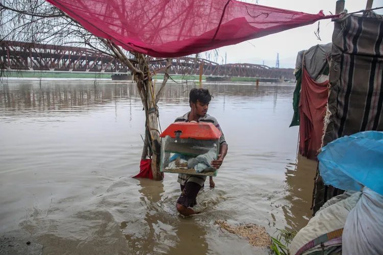 A view of the swollen Yamuna river as its water level rises near the Old Bridge, in New Delhi