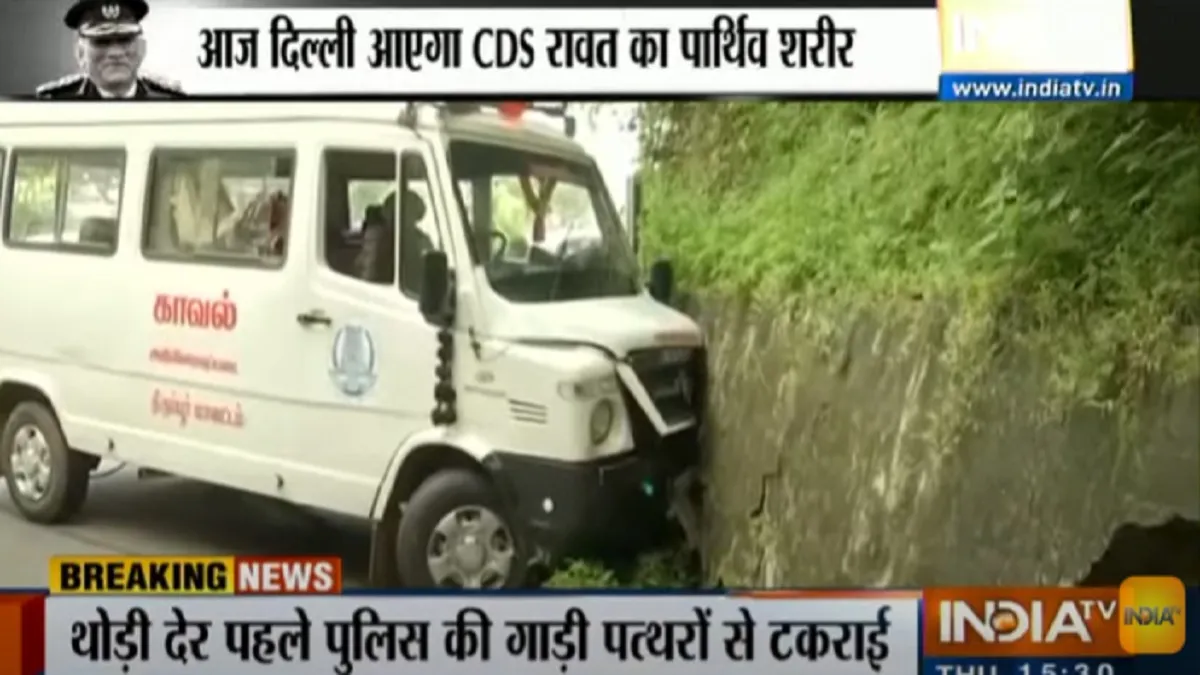 नई दिल्ली। कुन्नूर चॉपर हादसे में दिवंगत सैन्य अफसरों के पार्थिव शरीर ले जा रहा काफिला हादसे का शिकार हो गया। सेना के अधिकारियों के पार्थिव शरीर ले जा रहे काफिले में शामिल पुलिस की गाड़ी पत्थर से टकरा गई। कुन्नूर चॉपर क्रैश मामले की जांच तेजी से की जा रही है। क्रैश वाली जगह पर ड्रोन से जांच हो रही है। घने जंगलों की वजह से ड्रोन से जांच की जा रही है। तमिलनाडु में स्थानीय लोगों ने सीडीएस बिपिन रावत, उनकी पत्नी और अन्य कर्मियों के पार्थिव शरीर को ले जाने वाली एम्बुलेंस पर फूल बरसाए और 'भारत माता की जय' के नारे लगाए।