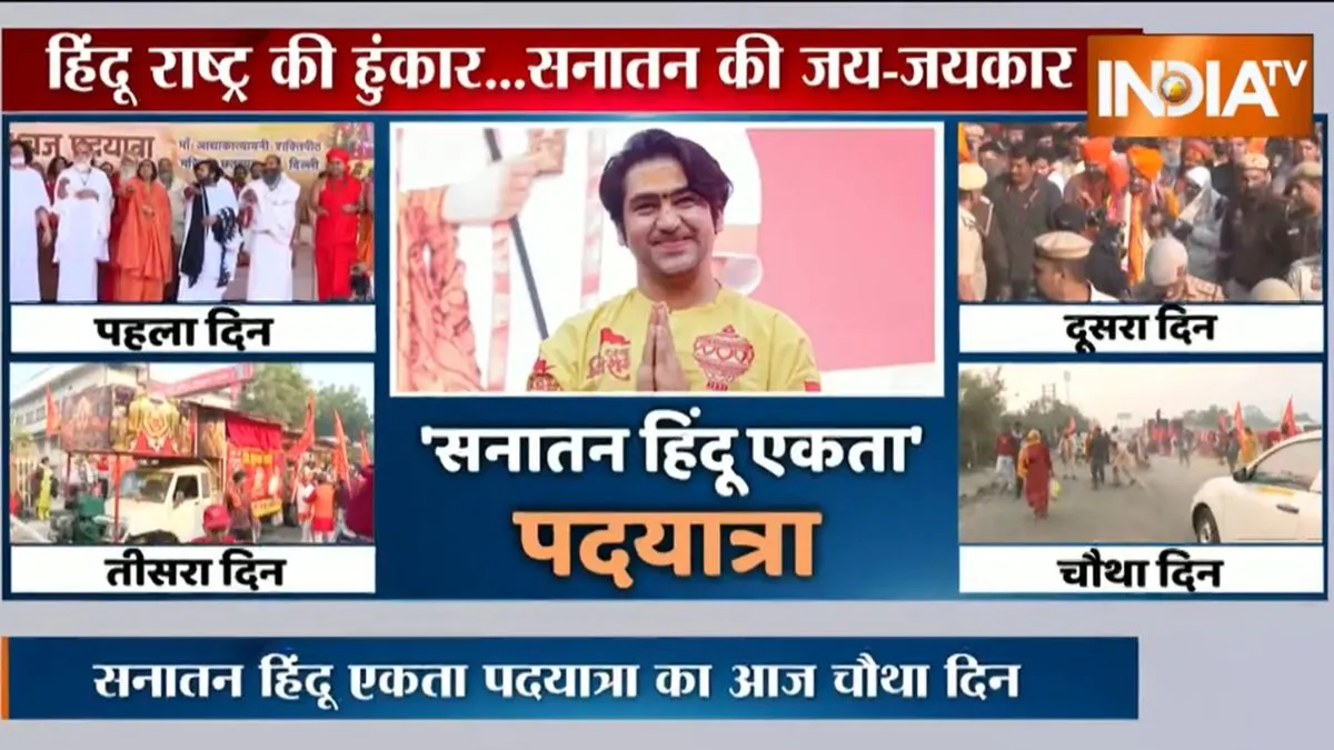 बाबा बागेश्वर की 'सनातन हिंदू एकता पदयात्रा' के दौरान भक्तों की अपार भीड़ उमड़ रही है। हर यात्रा में बाबा श्रद्धालुओं के साथ उन सात संकल्पों को दोहराते हैं जिन्हें लेकर वो ये यात्रा निकाल रहे हैं। बाबा बागेश्वर के साथ यात्रा में जब कथावाचक अनिरुद्धाचार्य पहुंचे तो धीरेन्द्र कृष्ण शास्त्री ने हिंदू राष्ट्र का संपल्प तो दोहराया ही, इसके अलावा उन्होंने लव जिहाद को धर्म के लिए सबसे बड़ा खतरा बताया। इसके अलावा तेलंगाना के चर्चित नेता टी राजा भी बाबा की पदयात्रा में शामिल हुए।