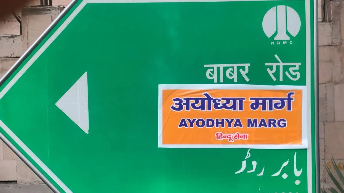 नई दिल्ली: हिंदू सेना ने शनिवार को नई दिल्ली में स्थित बाबर रोड के बोर्ड पर 'अयोध्या मार्ग' के नाम का स्टीकर चिपका दिया। रिपोर्ट्स के मुताबिक, यह स्टीकर ललित होटल के पास लगे एक साइन बोर्ड पर चिपकाया गया। इस बारे में बयान देते हुए हिंदू सेना के अध्यक्ष विष्णु गुप्ता ने कहा कि हिंदू सेना की बहुत लंबे समय से मांग थी कि बाबर रोड का नाम बदलकर किसी महापुरूष के नाम पर रखा गया। गुप्ता ने कहा कि आज हिंदू सेना के कार्यकर्ताओं ने वह काम कर दिया और बाबर रोड का नाम बदलकर 'अयोध्या मार्ग' रख दिया। हालांकि बाद में स्टीकर को प्रशासन के द्वारा हटा दिया गया।