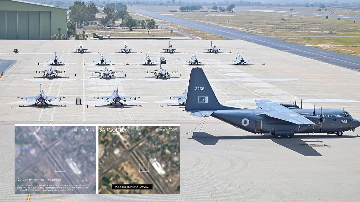 यह जानकारी ओपन-सोर्स इंटेलिजेंस (OSINT) विश्लेषक, सैन्य गतिविधियों और भू-राजनीतिक घटनाओं की निगरानी के लिए जाने-माने एक्सपर्ट Damien Symon की ट्वीट से मिली है। उन्हें एक्स पर ट्वीट कर सरगोधा एयरबेस रनवे की दो सैटेलाइट तस्वीर साझा की है। एक तस्वीर हमले के पहले की है। दूसरी तस्वीर हमले के बाद की है। इसमें साफ दिखाई दे रहा है कि हमले के बाद रनवे के बीचोबीच में एक गहरा गड्ढा हो गया है।