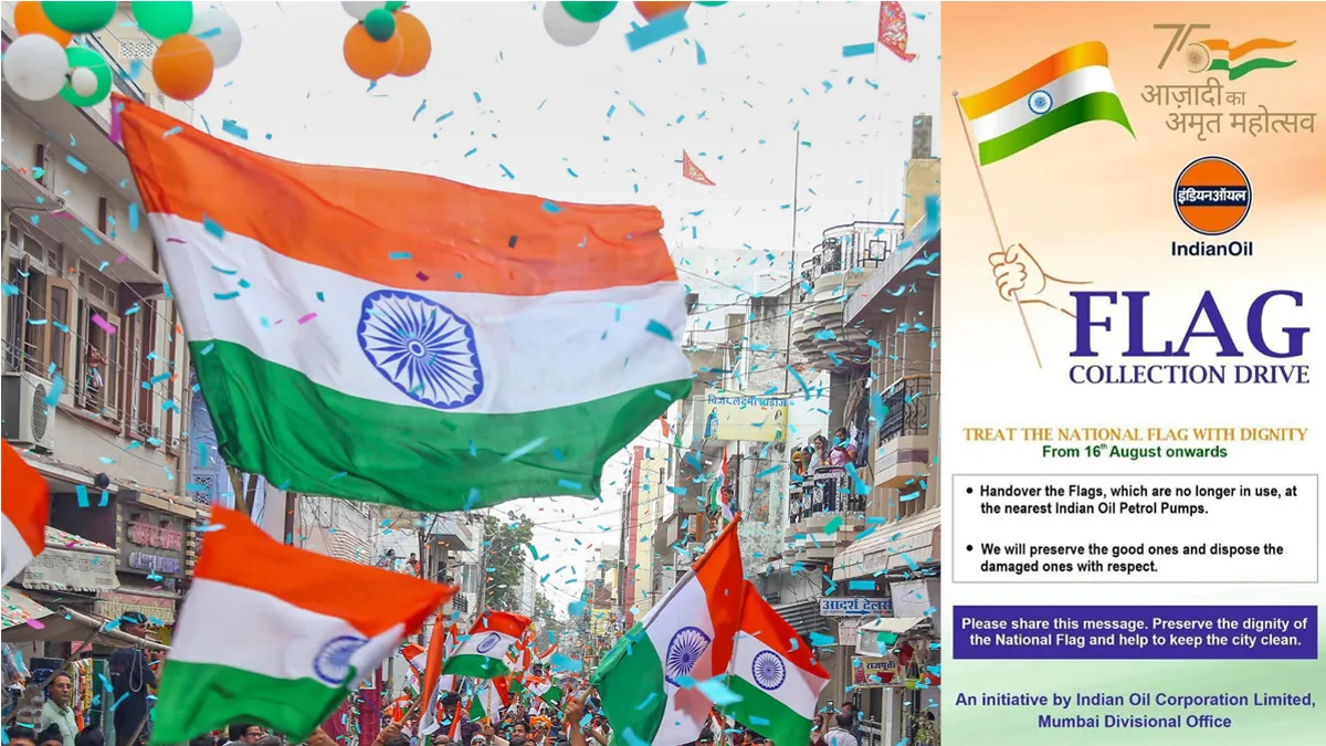 Indian Oil Flag Collection Drive: भारत की स्वतंत्रता के 75 साल पूरे होने के मौके पर चलाए गए 'हर घर तिरंगा' अभियान को देश के करोड़ों लोगों ने मिलकर सफल बनाया। यह अभियान 'आजादी का अमृत महोत्सव' के अंतर्गत चलाया गया था। स्वतंत्रता दिवस के दिन तिरंगे को लेकर लोगों में इस कदर उल्लास पहले शायद ही किसी को देखने को मिला हो। देश के लगभग हर घर में 15 अगस्त को तिरंगा लहरा रहा था। हालांकि अब अगला कदम तिरंगे को पूरी गरिमा के साथ सुरक्षित रखने का है। इसके लिए इंडियन ऑयल ने एक मुहिम चलाई है।