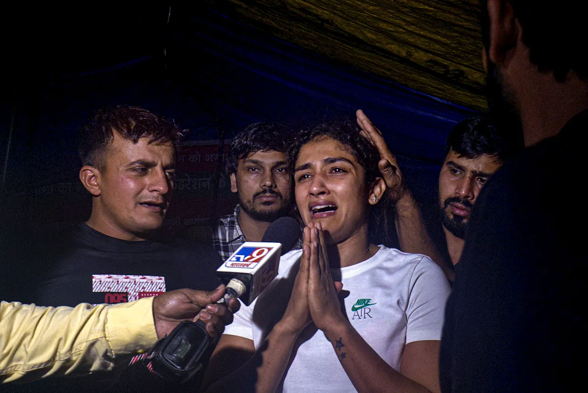 विनेश फोगाट ने दिल्ली पुलिस से हुए विवाद को लेकर कहा कि क्या इसी दिन के लिए हमने मेडल जीते थे। उन्होंने पुलिस पर आरोप लगाते हुए कहा कि नशे में धुत एक पुलिसकर्मी ने हमारे साथ बदतमीजी की है। हम अपने मान सम्मान की लड़ाई लड रहे हैं। पुलिस पर सवाल खड़ा करते हुए उन्होंने कहा कि यहां पुलिस वाले हमें चेस्ट से धक्का दे रहे हैं। बृजभूषण सिंह के खिलाफ बोलते हुए उन्होंने कहा कि इतने कांड के बाद बृजभूषण सिंह अपने घर में आराम से सो रहा है लेकिन हमें यहां ऐसी हालातों का सामना करना पड़ रहा है।