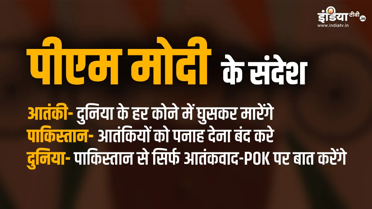 प्रधानमंत्री नरेंद्र मोदी ने सोमवार रात राष्ट्र को संबोधित किया। इस दौरान उन्होंने देशवासियों को बताया कि पहलगाम आतंकी हमले के बाद भारत ने किस तरह सीमा पार आतंकियों का खात्मा किया। उन्होंने यह भी बताया कि जब पाकिस्तान ने आतंकवादियों के समर्थन में भारत पर हमला किया तब भारतीय सेना ने मुंहतोड़ जवाब दिया। अपने संबोधन में पीएम मोदी ने आतंकियों, पाकिस्तान और दुनिया को लेकर साफ संदेश भी दिए।
