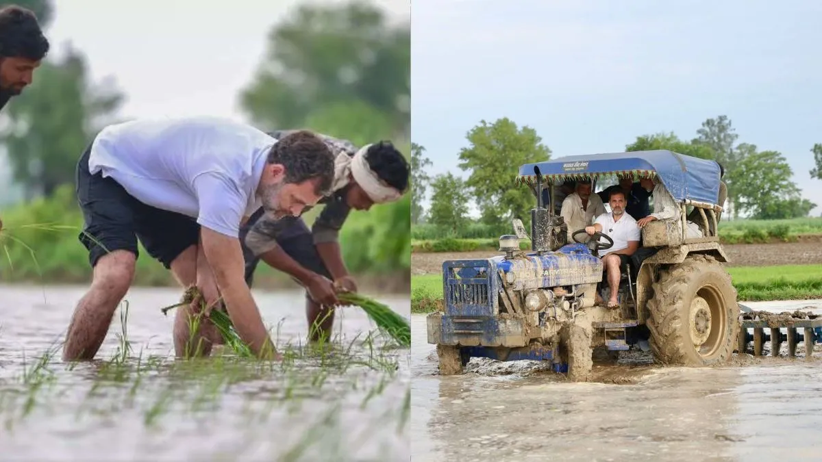 राहुल गांधी ने ट्रैक्टर भी चलाया और किसानों के साथ खेत में धान की रोपाई