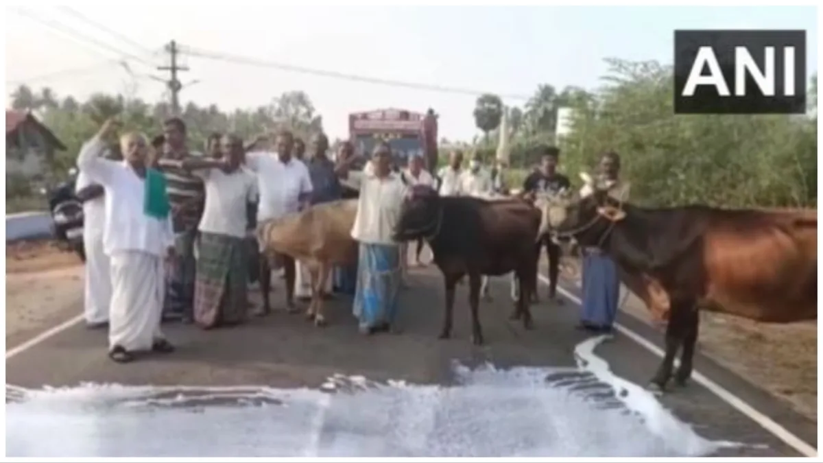तमिलनाडु में किसानों द्वारा दूध की खरीद कीमतों को बढ़ाने को लेकर अनिश्चितकालीन हड़ताल किया जा रहा है। डेयरी के कीमतों में वृद्धि करने की मांग को लेकर तमिलनाडु में अलग अलग स्थानों पर विरोध प्रदर्शन देखने को मिल रहा है। बीते दिनों इरोड में किसानों द्वार दूध को सड़क पर फेंक कर विरोध प्रदर्शन किया गया। वहीं अब मदुरै के उसिलामपट्टी में डेयरी प्रोडक्ट को किसानों ने रोड पर फेंक दिया। इसका वीडियो सोशल मीडिया पर सर्कुलेट हो रहा है।