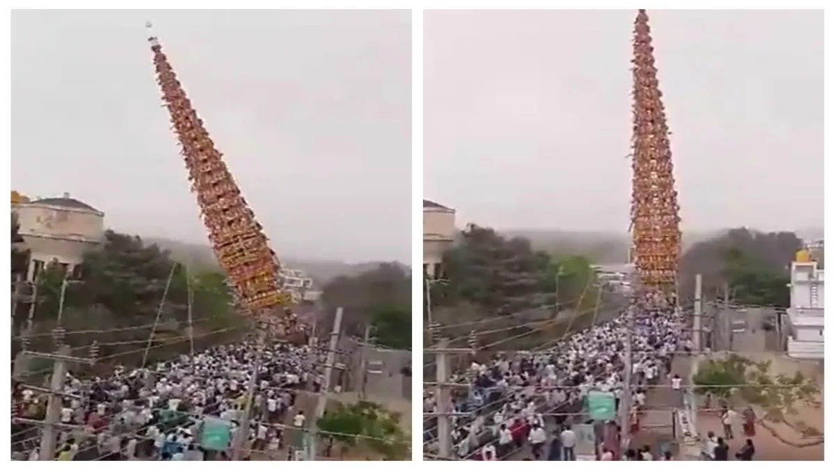 कर्नाटक: अनेकल (बैंगलोर ग्रामीण) में ग्रामीण उत्सव के दौरान 100 फीट ऊंचा रथ गिर गया, जिसमें दो लोग घायल हो गए। ग्रामीण एसपी ने अस्पताल में इलाज के दौरान एक व्यक्ति की मौत की पुष्टि की है। घटना शनिवार की शाम करीब छह बजे की है। इस घटना का वीडियो सामने आया है जिसमें देखा जा सकता है कि कैसे 100 फीट ऊंचा रथ अचानक डगमगाने लगता है और लोगों की भीड़ के ऊपर ही गिर जाता है।