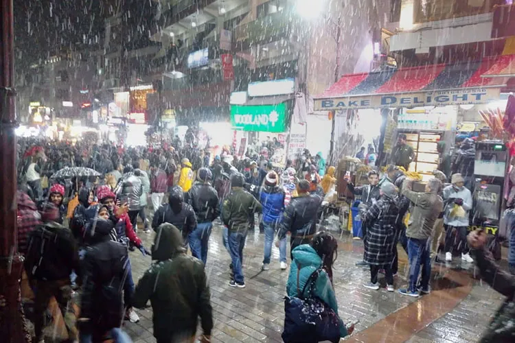 शिमला: हिमाचल प्रदेश में पारा लुढ़क गया है। क्रिसमस और नए साल से पहले मौसम ने करवट ली और राज्य के कई हिस्सों में बर्फबारी का सिलसिला शुरू हो गया जिससे मौसम में तेजी से गिरावट आई है। सर्द हवाओं के रुख से ठिठुरन बढ़ गई है। मनाली में सीजन की पहली बर्फबारी हुई है जिससे सैलानियों के चेहरे पर रौनक आ गई है। मनाली में बर्फ़, बारिश की बूदों की तरह बरस रही है जिसका पर्यटक जमकर लुत्फ उठा रहे हैं। मनाली के माल रोड पहुंचे सैलानी बर्फबारी को जमकर एंजॉय कर रहे हैं और खूब मस्ती कर रहे हैं। पूरा माल रोड बर्फ की सफेद चादर में लिपटा नजर आ रहा है।