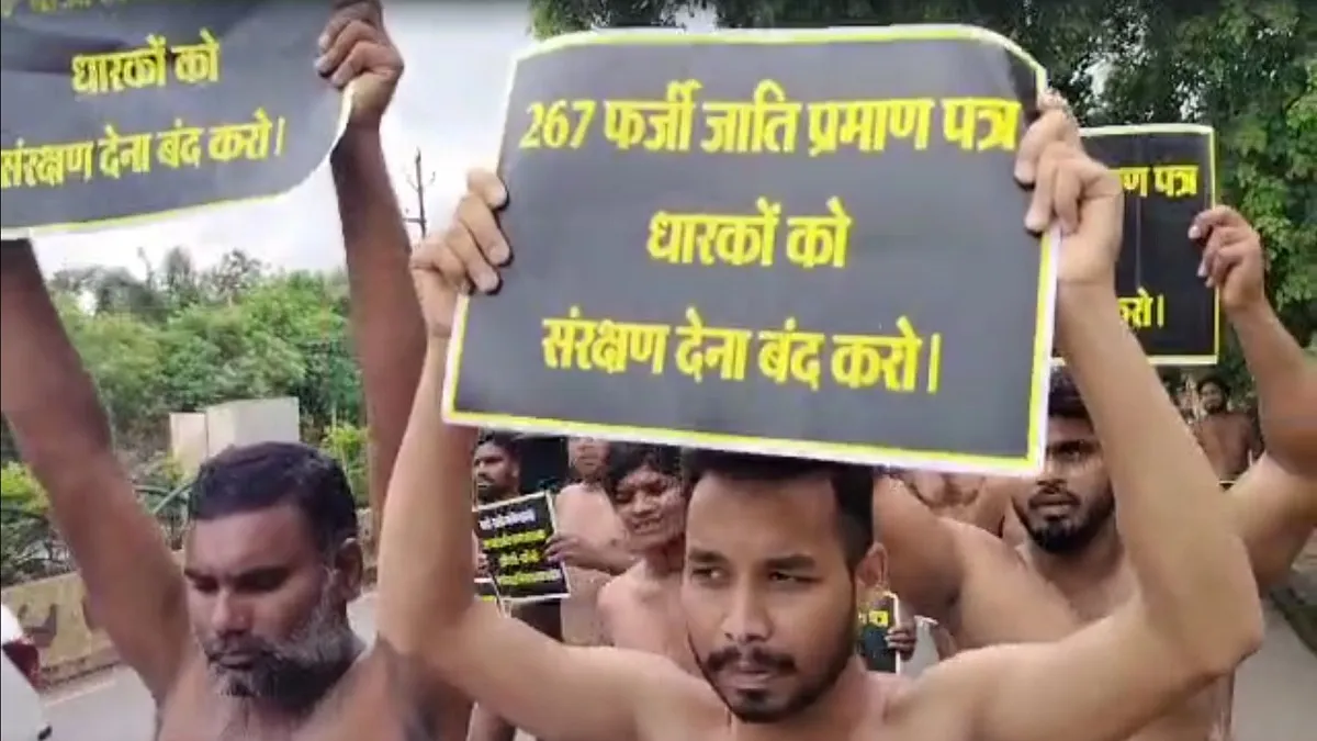 आज विधानसभा के मानसून सत्र के पहले दिन अनुसूचित जाति जनजाति के आंदोलित युवाओं ने निर्वस्त्र होकर ऐसे लोगों के खिलाफ कार्रवाई की मांग की है। यह प्रदर्शन अनुसूचित जाति-जनजाति वर्ग फर्जी जाति प्रमाण पत्र मामला संघर्ष समिति के बैनर तले किया जा रहा है। समिति से जुड़े युवाओं का कहना है कि फर्जी जाति प्रमाणपत्र के जरिए कई अधिकारी और कर्मचारी सरकारी नौकरी कर रहे हैं। इसे देखते हुए राज्य सरकार ने उच्च स्तरीय जाति छानबीन समिति गठित की थी। इसकी रिपोर्ट पर सामान्य प्रशासन विभाग ने कार्रवाई के निर्देश भी दिए थे इसके बाद भी इस आदेश का पालन नहीं हो रहा है जिसको लेकर आज इस तरह से नग्न होकर प्रदर्शन किया गया।