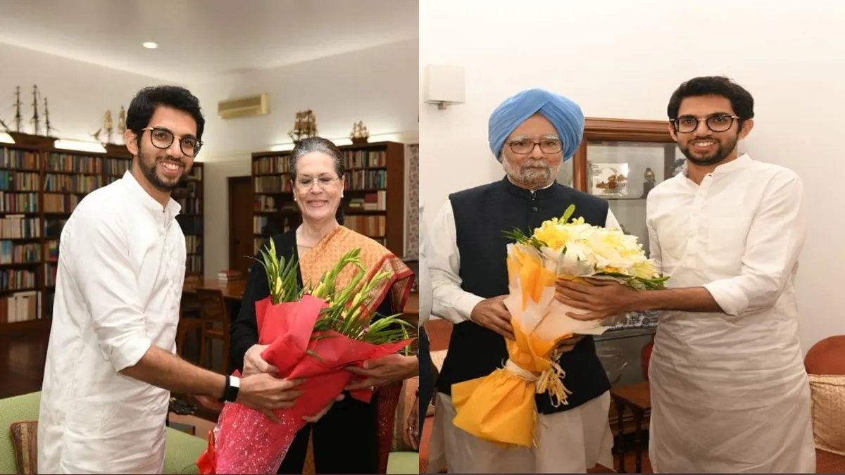 नयी दिल्ली: शिवसेना नेता और महाराष्ट्र के भावी मुख्यमंत्री उद्धव ठाकरे के पुत्र आदित्य ठाकरे ने बुधवार को कांग्रेस अध्यक्ष सोनिया गांधी और पूर्व प्रधानमंत्री मनमोहन सिंह से मुलाकात कर उन्हें शपथ ग्रहण समारोह के लिए आमंत्रित किया। आदित्य पहले सोनिया के आवास पहुंचे और फिर उन्होंने मनमोहन सिंह से भेंट की। मुलाकात के बाद आदित्य ने कहा कि उन्होंने भेंट की है क्योंकि इन दोनों नेताओं के मार्गदर्शन और आशीर्वाद की जरूरत है।