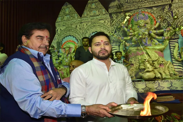 पटना: शारदीय नवरात्र की सप्तमी तिथि यानी मंगलवार को यहां के पंडालों में देवी दुर्गा के पट खुलते ही भक्तों की भीड़ उमड़ पड़ी। एक पंडाल में भाजपा सांसद शत्रुघ्न सिन्हा और बिहार विधानसभा में नेता प्रतिपक्ष तेजस्वी यादव साथ-साथ दिखे। दोनों नेताओं ने देवी दुर्गा की साथ ही पूजा की। 'बिहारी बाबू' ने तेजस्वी के ललाट पर तिलक लगाया। डाक बंगला चौराहे के पास बने पंडाल में सांसद सिन्हा और पूर्व उपमुख्यमंत्री तेजस्वी ने मां दुर्गा की प्रतिमा को नमन किया, फूल-प्रसाद चढ़ाकर पूजा-अर्चना की। इसके बाद अभिनेता-राजनेता व पूर्व केंद्रीय मंत्री शत्रुघ्न सिन्हा ने तिलक लगाकर तेजस्वी को शुभकामना दी।