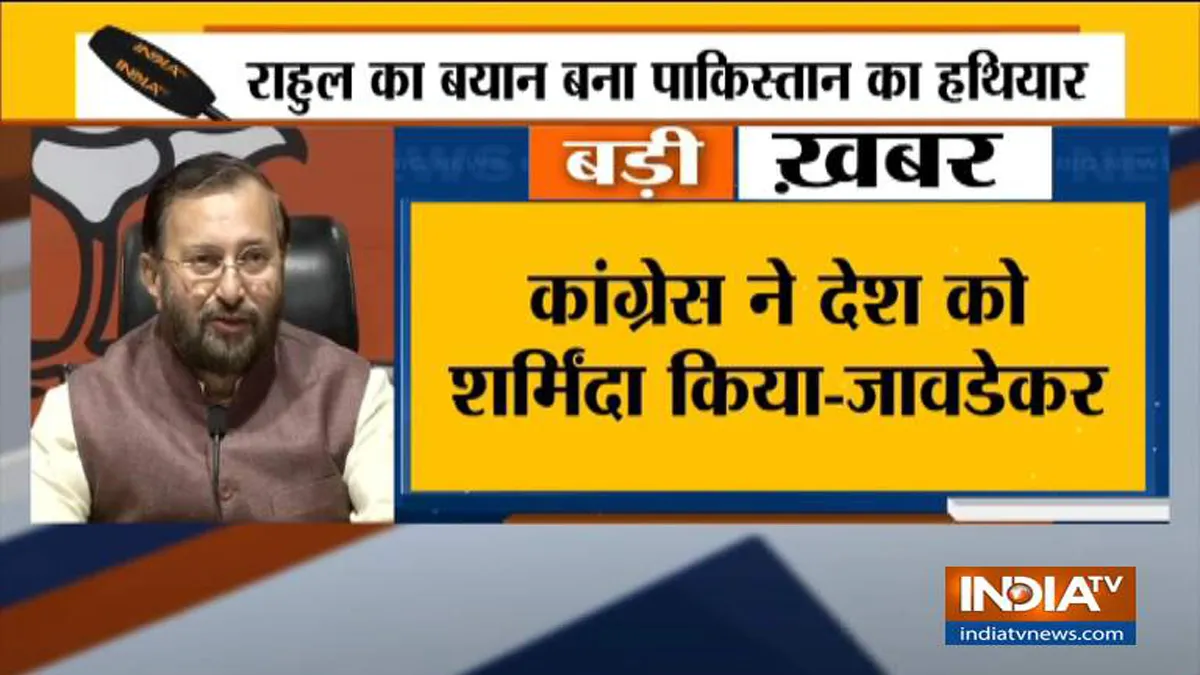 जावड़ेकर ने कहा, 'राहुल गांधी ने जम्मू कश्मीर.में हिंसा,लोगों के मरने का बयान दिया...कहां से जानकारी लाए ? राहुल गांधी आपकी जानकारी गलत...पाकिस्तान में ये बयान खूब चला और यू एन को दी शिकायत में पाकिस्तान ने इसका जिक्र किया है।' जावड़ेकर ने कहा कि देश के आक्रोश और गुस्से के चलते राहुल ने यू टर्न लेते हुए अपना बयान बदला।
