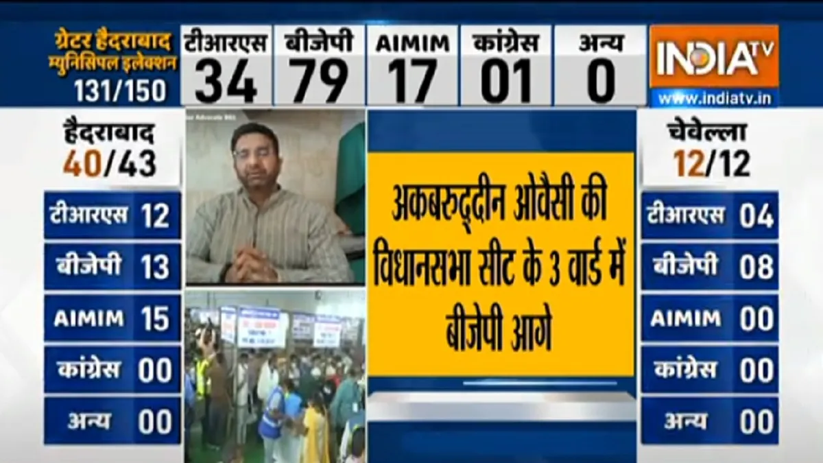 हैदराबाद. ग्रेटर हैदराबाद नगर निगम (जीएचएमसी) चुनाव की मतगणना शुक्रवार सुबह आठ बजे शुरू हो गई। शुरुआती रुझानों में भारतीय जनता पार्टी ने सबकी को चौंकाते हुए बढ़त बना ली है। खबर लिखे जाने तक भारतीय जनता पार्टी ने हैदराबाद निकाय चुनावों में 79 सीटों पर बढ़त बना ली थी, जबकि राज्य की सत्ता में काबिज TRS 34 सीटों पर बढ़त के साथ दूसरे नंबर पर चल रही है। ओवैसी की पार्टी AIMIM के लिए शुरुआती रुझान अच्छे नहीं दिखाई दे रहे हैं। अभी तक AIMIM सिर्फ 18 सीटों पर आगे चल रही है। कांग्रेस पार्टी ग्रेटर हैदराबाद नगर निगम (जीएचएमसी) चुनाव में बेहद खराब प्रदर्शन करती दिखाई दे रही है। कांग्रेस महज 02 सीटों पर आगे है।