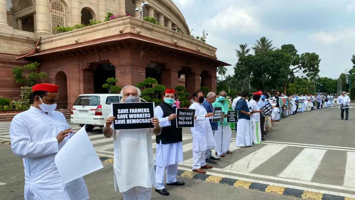 नई दिल्ली: संसद से पारित किसान बिल को लेकर सरकार और विपक्ष के बीच जंग छिड़ी हुई है। इस बिल को लेकर राज्यसभा में हंगामा हुआ था जिसके बाद 8 सांसदों को निलंबित कर दिया गया था। उसके बाद से ही समूचे विपक्ष ने संसद के दोनों सदनों का बहिष्कार किया हुआ है। आज शाम 5 बजे ही विपक्षी पार्टियां राष्ट्रपति रामनाथ कोविंद से मुलाकात करेंगी। इस बीच संसद परिसर में सभी विपक्षी पार्टियां प्रदर्शन कर रही हैं। इस दौरान सभी के हाथ में किसान बचाओ के प्लेकार्ड भी हैं। प्रदर्शन में कांग्रेस के जयराम रमेश, गुलाम नबी आजाद, तृणमूल कांग्रेस के डेरेक ओ ब्रायन समेत विपक्ष के कई नेता मौजूद हैं। संसद परिसर में विपक्षी पार्टियों के नेताओं ने गांधी मूर्ति से लेकर अंबेडकर मूर्ति तक मार्च भी निकाला।