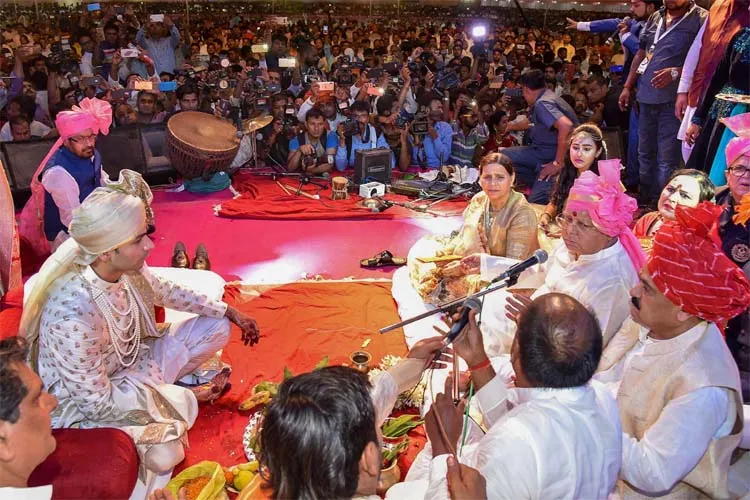 पटना: बिहार में लालू यादव के बड़े बेटे तेजप्रताप की शादी में सियासत का हर बड़ा नाम शामिल हुआ है। बिहार मुख्यमंत्री नीतीश कुमार भी बारात में शामिल हुए। लालू प्रसाद और तेजस्वी ने नीतीश का स्वागत किया। केंद्रीय मंत्री रामविलास पासवान समेत राजनीति की कई बड़ी हस्तियां तेजप्रताप की शादी में शामिल हुई। करीब दस हजार बाराती तेज प्रताप की शादी में शामिल हुए।लंबे अरसे के बाद लालू के परिवार में खुशियां आयी हैं। पूरा घर नाच गा रहा है। बड़ी बहू को घर में लाने के लिए लालू परिवार दुल्हन के दरवाजे पर पहुंचा।