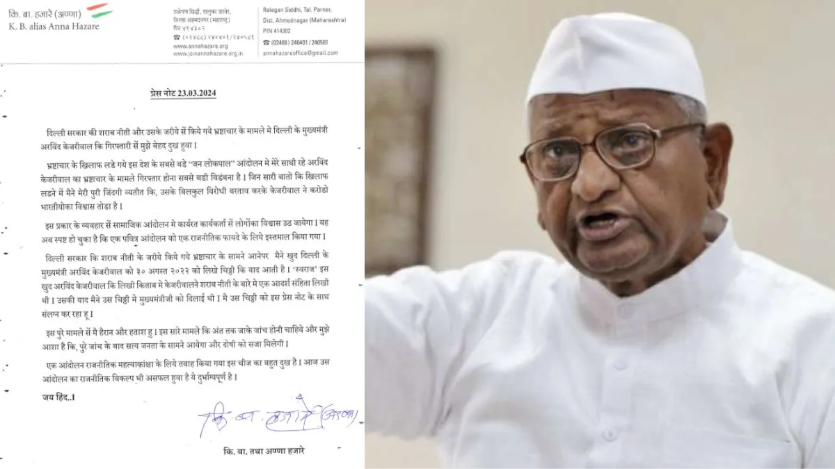 नई दिल्ली: दिल्ली के सीएम अरविंद केजरीवाल की गिरफ्तारी के बाद समाजसेवी अन्ना हजारे का बयान सामने आया है। उन्होंने प्रेसनोट में कहा, 'भ्रष्टाचार के मामले में दिल्ली के सीएम अरविंद केजरीवाल की गिरफ्तारी से मुझे बेहद दुख हुआ। जनलोकपाल आंदोलन में मेरे साथी रहे केजरीवाल का भ्रष्टाचार के मामले में गिरफ्तार होना सबसे बड़ी विडंबना है। जिन बातों के खिलाफ लड़ने के लिए मैंने पूरी जिंदगी बिता दी, उसके बिल्कुल विपरीत व्यवहार करके केजरीवाल ने करोड़ों भारतीयों का विश्वास तोड़ा है।'