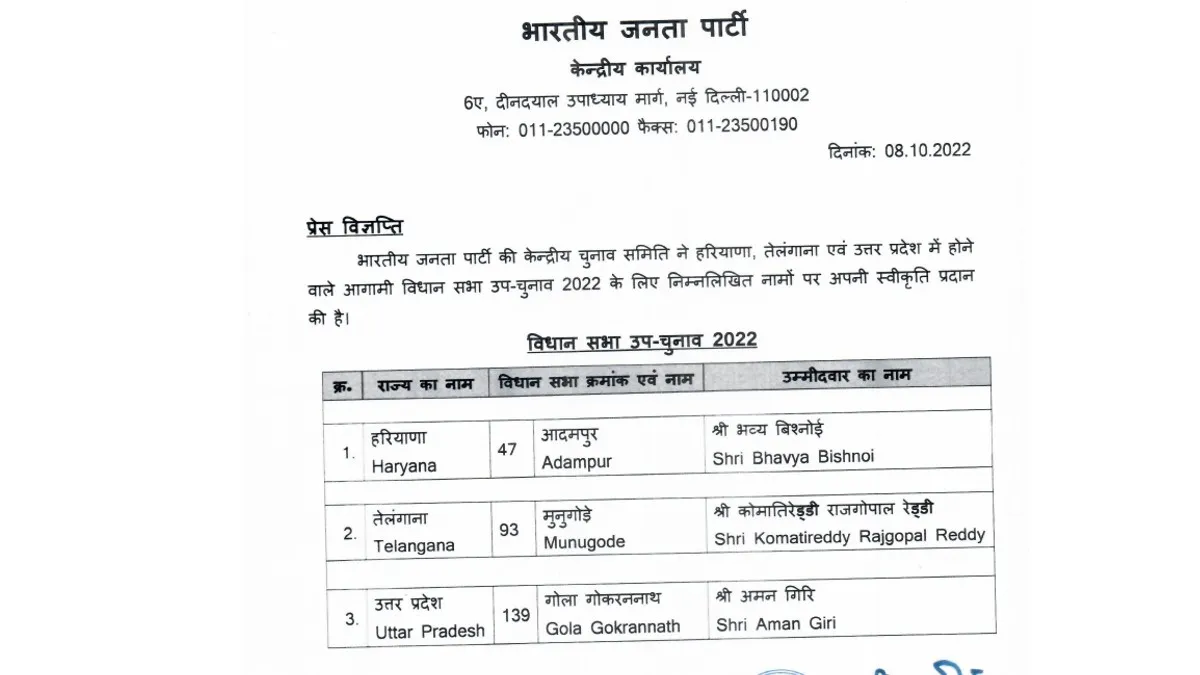 BJP: आगामी उपचुनावों के लिए भारतीय जनता पार्टी ने तीन विधानसभा की सीटों के लिए अपने प्रत्याशी घोषित कर दिए हैं। बीजेपी ने हरियाणा की आदमपुर, उत्तर प्रदेश की गोला गोकरननाथ और तेलंगाना की मुनुगोडे सीट से अपना प्रत्याशी घोषित कर दिए हैं। इन तीनों सीटों समेत देशभर की 7 विधानसभा सीटों पर आगामी 3 नवंबर को मतदान होंगे और छह नवंबर को मतगणना के बाद उपचुनाव के परिणाम घोषित कर दिए जाएंगे।