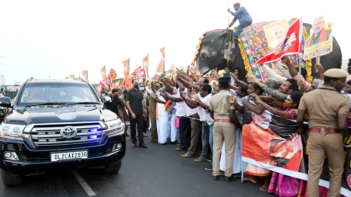 एक जगह तो मोदी ने एक मिनट के लिए अपनी कार रोकी और गाड़ी के रनिंग बोर्ड पर खड़े होकर पार्टी कार्यकर्ताओं का अभिवादन किया। पिछले साल DMK के सत्ता में आने के बाद यह उनका पहला तमिलनाडु दौरा है। ‘कथकली’ की पोशाक पहने कई कलाकार प्रधानमंत्री के स्वागत के लिए सड़क किनारे कतार में खड़े दिखे। नेहरू इंडोर स्टेडियम के पास हाथी का एक बड़ा-सा पुतला लगाया गया था और कार्यकर्ताओं ने अपने हाथों में ‘पूर्णकुंभम’ लेकर मोदी का गर्मजोशी से स्वागत किया। पूर्णकुंभम में एक बर्तन, नारियल और आम के पल्लव होते हैं, जिसे स्वागत का पवित्र तरीका माना जाता है।