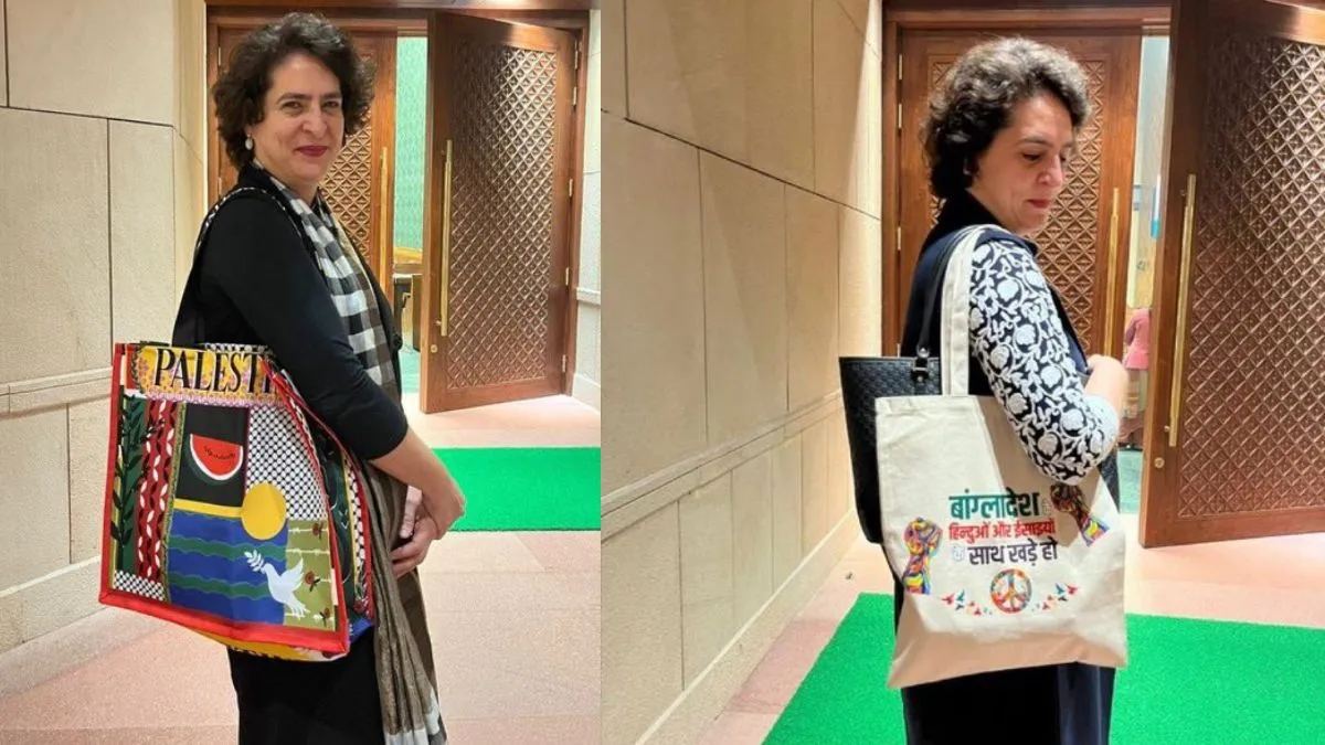 नई दिल्ली: कांग्रेस महासचिव और वाडनाड से सांसद प्रियंका गांधी वाद्रा फिलिस्तीन लिखे बैग को लेकर काफी चर्चा में रहीं। वहीं सोमवार को फिलिस्तीन का बैग लेकर जाने के बाद हुए विवाद के बाद अब प्रियंका गांधी अगले दिन दूसरा बैग लेकर संसद पहुंचीं। प्रियंका गांधी जिस बैग को लेकर आज संसद पहुंचीं उस पर लिखा था, 'बांग्लादेश के हिंदुओं और ईसाइयों के साथ खड़े हों'। बता दें कि प्रियंका गांधी कल एक बैग लेकर संसद गई थीं, जिसपर फिलिस्तीन लिखा हुआ था, जिसे लेकर दिन भर बयानबाजी हुई। हालांकि प्रियंका गांधी से जब इसे लेकर सवाल किया गया तो उन्होंने फिलिस्तीन का नाम न लेते हुए बांग्लादेश का जिक्र किया था।