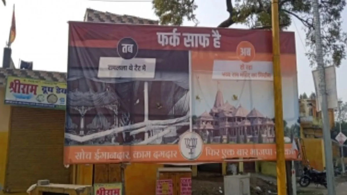 इसी तरह की होर्डिंग शहर के अन्य कई स्थानों पर भी लगी हुई है। होर्डिंग्स में सबसे ऊपर लिखा है फर्क साफ है और सबसे नीचे भाजपा का चुनाव चिन्ह कमल का फूल बना है। होर्डिंग के ऊपरी हिस्से में जहां तब व अब की उपलब्धि बताने की कोशिश की गई है। तब के नीचे टेंट में विराजमान रामलला व अब के नीचे निमार्णाधीन राम मंदिर का मॉडल है। इसी तरह होर्डिंग के निचले हिस्से में सोच ईमानदार, काम दमदार और एक बार भाजपा सरकार लिखा हुआ है।