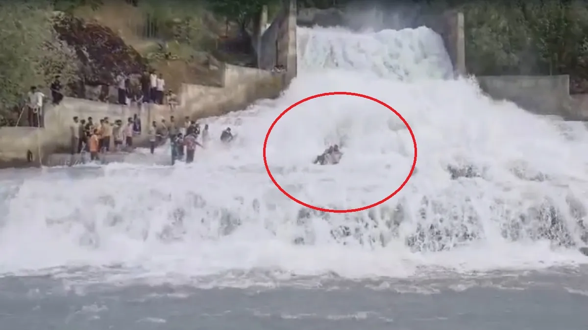 Video: झरने का तेज बहाव और बीच चट्टान में फंसे दो शख्स... इस तरह बचाई गई दोनों की जान