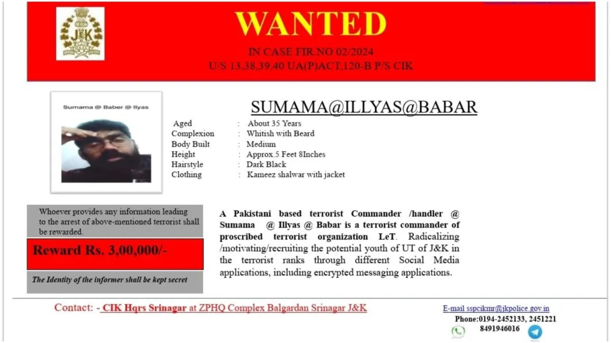 उक्त आतंकवादी हैंडलर एन्क्रिप्टेड मैसेजिंग एप्लीकेश सहित विभिन्न सोशल मीडिया एप्लीकेशन के माध्यम से केंद्र शासित प्रदेश जम्मू कश्मीर में भोले-भाले युवाओं को आतंकवादी रैंकों में शामिल करने के लिए उन्हें प्रेरित करता था और भर्ती करता था। घाटी में आतंकवादी घटनाओं को अंजाम देने के लिए विभिन्न आतंकवादी संगठनों के लिए धन जुटाने और धन पहुंचाने के लिए कश्मीरी युवाओं का वह कूरियर के रूप में इस्तेमाल कर रहा है। सीआई कश्मीर ने प्रतिबंधित आतंकवादी संगठन लश्कर ए तैयबा के पाक स्थिति कमांडर/हैंडलर के ऊपर 3 लाख रुपये नकद इनाम की घोषणा की है।