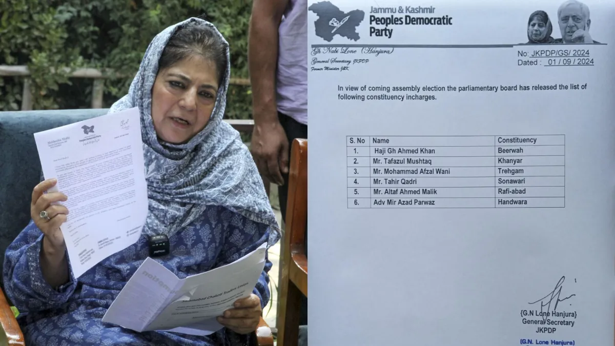 महबूबा मुफ्ती की पार्टी पीडीपी (जम्मू कश्मीर पीपल्स डेमोक्रेटिक पार्टी) ने छह प्रभारियों की लिस्ट जारी कर दी है। यहां दूसरे चरण के मतदान के लिए नोटिफिकेशन जारी हो चुका है और पांच सितंबर तक उम्मीदवार अपना नामांकन कर सकते हैं। इसके बाद आवेदन की जांच की जाएगी और उम्मीदवारों के पास नौ सितंबर तक नाम वापस लेने का समय होगा। यहां तीन चरणों में मतदान होना है। पहले चरण के लिए नाम वापस लेने की आखिरी तारीख खत्म हो चुकी है।