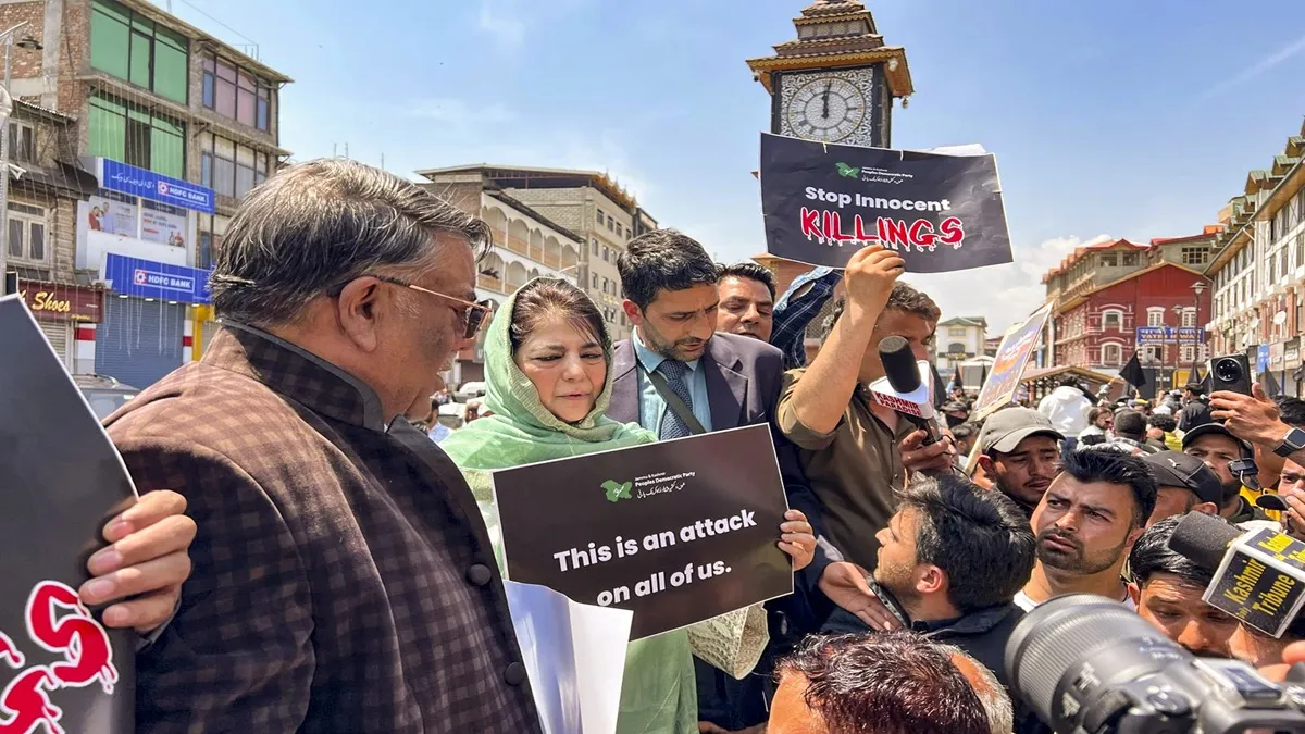 श्रीनगर: पीपुल्स डेमोक्रेटिक पार्टी (PDP) की अध्यक्ष और पूर्व मुख्यमंत्री महबूबा मुफ्ती ने जम्मू-कश्मीर के पहलगाम में हुए आतंकी हमले के खिलाफ बुधवार को पार्टी नेताओं और कार्यकर्ताओं के साथ मिलकर मार्च निकाला। इस आतंकवादी हमले में मंगलवार को 26 लोगों की मौत हो गई थी, जिनमें से ज्यादातर टूरिस्ट थे। मुफ्ती और पीडीपी कार्यकर्ता श्रीनगर में शेर-ए-कश्मीर पार्क के पास पार्टी मुख्यालय में इकट्ठे हुए और वहां से विरोध मार्च की शुरुआत की। मार्च के दौरान प्रदर्शनकारियों ने हाथों में तख्तियां लेकर लोगों की हत्या के खिलाफ आवाज़ बुलंद की। तख्तियों पर लिखा था -"यह हम सभी पर हमला है", "निर्दोषों की हत्या आतंकी कृत्य है" और "निर्दोषों की हत्या बंद करो।"