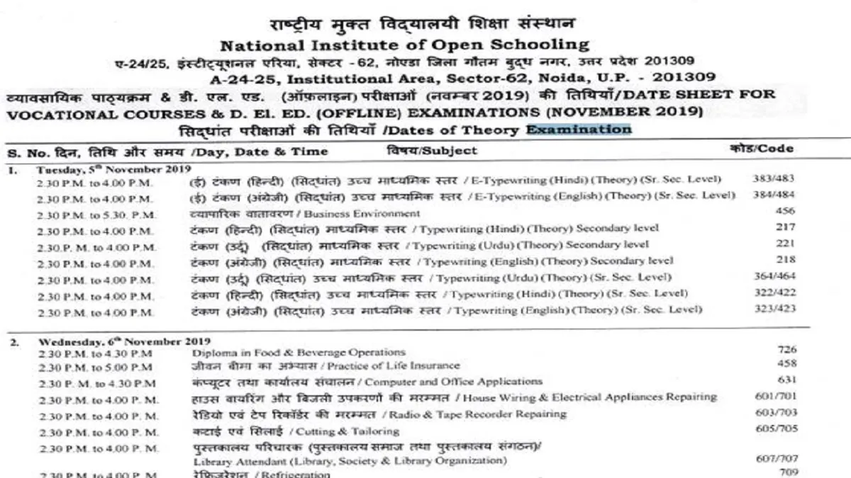 NIOS DELEd Exam Date Sheet 2019: नैशनल इंस्टीट्यूट ऑफ ओपन स्कूलिंग ने डीएलड परीक्षा की डेटशीट जारी कर दी है। इस डेटशीट को एनआईओएस की ऑफिशल वेबसाइट nios.ac.in. पर जाकर देख सकते हैं। एनआईओएस की ऑफिशल डेटशीट के मुताबिक परीक्षा का आयोजन 5 नवंबर 2019 से किया जा रहा है। वहीं अंतिम परीक्षा का आयोजन 28 नवंबर 2019 को किया जाएगा। यह टाइमटेबल डीएलएड और वोकेशन विषयों की परीक्षा का जारी किया गया है। दोनो ही परीक्षाओं की शुरुआत नवंबर 2019 से होगी। इन सभी परीक्षाओं का आयोजन दोपहर 2.30 बजे से होगा लेकिन विषयों के मुताबिक सभी पेपर्स के खत्म होने का समय अलग-अलग है।