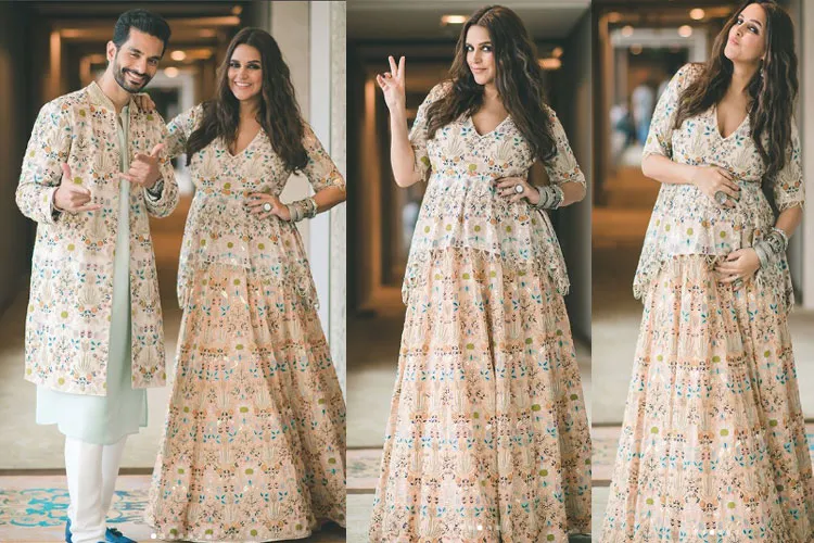जहां नेहा ने लहंगा स्कर्ट के साथ चोली पहना था, जिसका डिज़ाइन अंगद के शेरवानी के रुप में व्हाइट कुर्ता-पायजामा के साथ पहनी।