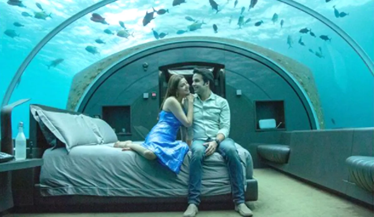 काजल अग्रवाल ने एक फोटो शेयर की है, जिसमें वो पति गौतम किचलू के साथ बेड पर बैठी हुई हैं, लेकिन खास बात ये है कि उनका ये बेडरूम समुंदर के अंदर बना हुआ है। उनके ऊपर ढेर सारी मछलियां तैरती हुई दिखाई दे रही हैं।