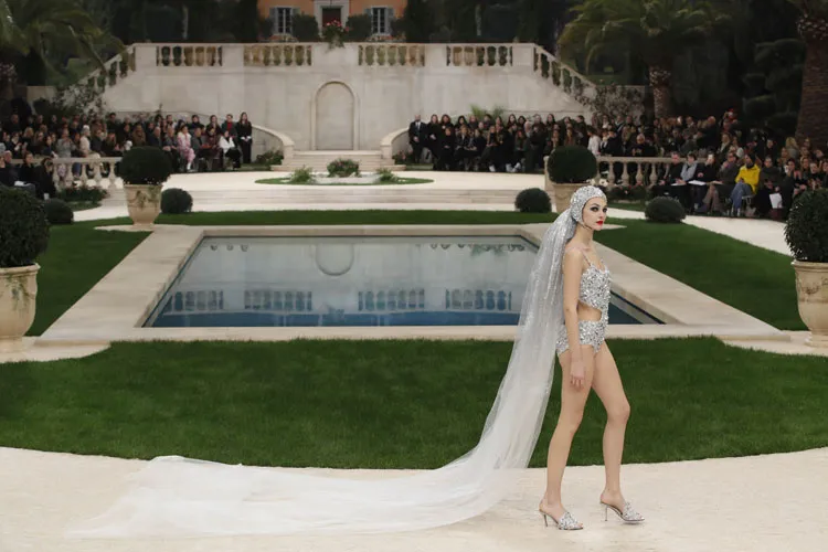 पेरिस में आयोजित मॉडल विटोरिया केरेटी वन पीस बाथिंग सूट में रैप वॉक करते हुए नजर आए। जिसमें मोनोकनी हैवी एम्बेलिशमेंट थी और वेस्ट डिफाइनिंग कटआउट था। इसके अलावा इस आउटफिट में ब्राइडल स्विम कैप और चमकदार लंबा वेल था।