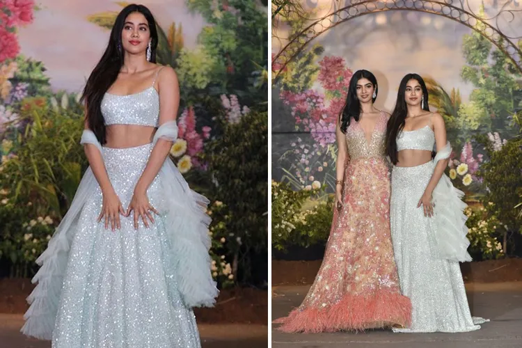 जाह्नवी कपूर से सोनम की रिसेप्शन पार्टी में एकदम लाइट ब्लू कलर का shimmery लहंगा पहना हुआ था, जिसके साथ बड़ा ही स्टाइलिश मैचिंग ब्लाउज था। उन्होंने दुपट्टे को हाथों में कैरी किया था। इस स्टाइलिश ड्रेस को फैशन डिजाइनर मनीष मल्होत्रा ने डिजायन किया था।