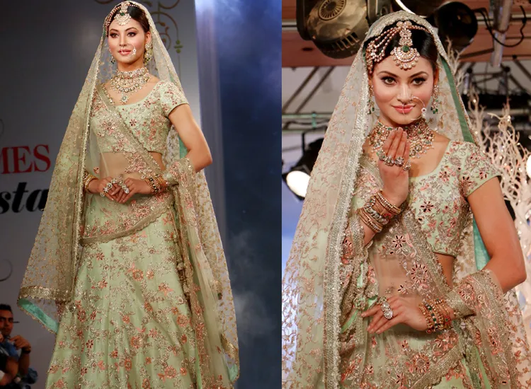 उवर्शी ने उस फैशन शो में ब्राइडल लुक में नजर आई। उन्होंने पैस्टल सी-ग्रीन ब्राइडल लहंगा पहना, जिसके साथ उन्होंने इम्ब्रॉयडरी डबल दुपट्टा कैरी किया, जिसमें उनका खूबसूरत अंदाज देखने को मिला। उन्होंने हैवी ज्वैलरी कैरी की और नाक में बड़ी सी नथ डाली, जो उन्हें सूट भी बेहद कर रही थी। वहीं एक्ट्रैस कृति खरबंदा भी पैस्टल कलर की खूबसूरत ड्रैस में रैंप करती दिखी।