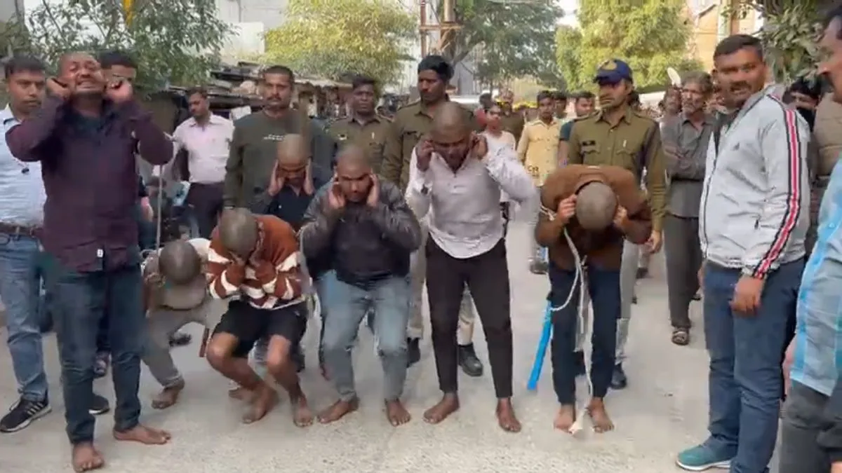 VIDEO: पुलिस ने बदमाशों का मुंडन कराकर ढोल नगाड़ों के साथ निकाला जुलूस, कान पकड़कर उठक-बैठक कराया