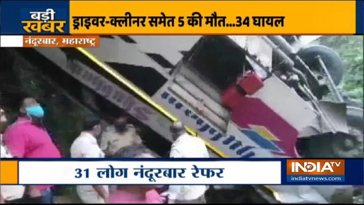 महाराष्ट्र के नंदुरबार में बड़ा सड़क हादसा हुआ है। मलकापुर से सूरत जा रही बस गहरी खाई में जा गिरी जिससे पांच लोगों की मौत हो गई जबकि 34 लोग घायल हो गए। घायलों में कुछ की हालत नाजुक बताई जाती है। जानकारी के मुताबिक मलकापुर से सूरत जा रही बस विसारवाडी के पास कोदईबारी घाट पहुंची ही थी कि अचानक अनियंत्रित होकर करीब 35 से 40 फीट गहरी खाई में जा गिरी। हादसे में बस ड्राइवर, क्लीनर और तीन यात्रियों की घटनास्थल पर ही मौत हो गई। हादसे में घायल 34 में से 31 लोगों को नंदुरबार के सिविल अस्पताल में इलाज के लिए रेफर किया गया है।