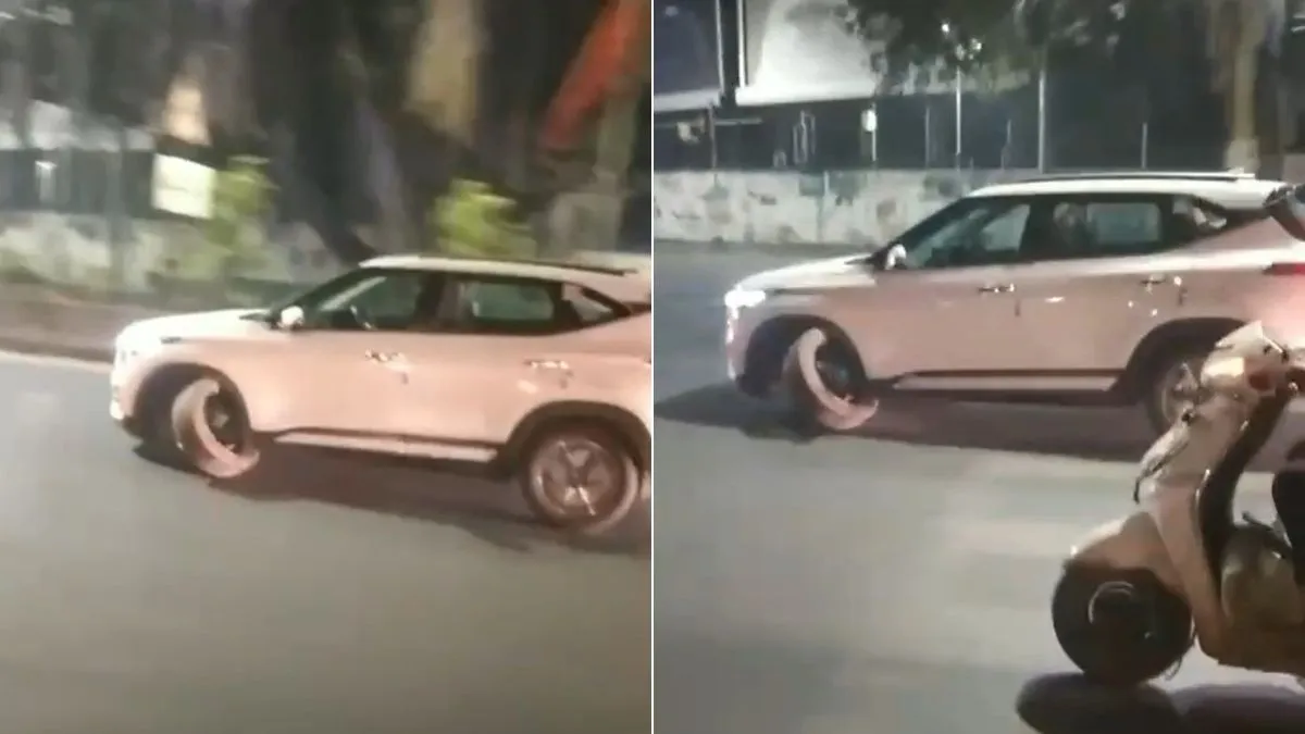 पुणे के कैंप इलाके में मंगलवार देर रात एक नशे में धुत कार चालक ने सड़क पर खतरनाक अंदाज में कार दौड़ाते हुए सनसनी फैला दी। हैरानी की बात यह रही कि कार का एक टायर बीच सड़क पर निकल गया, लेकिन चालक ने रफ्तार कम करने के बजाय गाड़ी को और तेज गति से दौड़ाया।