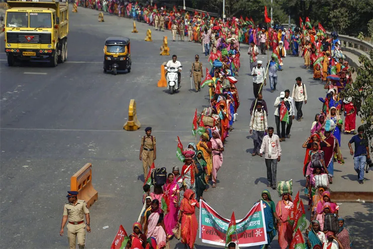 मुंबई: सूखे के लिए मुआवजे और आदिवासियों को वन्य अधिकार सौंपे जाने की मांग को लेकर लगभग 20 हजार किसान एवं आदिवासी मार्च कर रहे हैं। किसानों ने बुधवार को ठाणे से मुंबई तक 2 दिवसीय मार्च शुरू किया था और आज इसे आजाद मैदान पहुंचना है। लगभग 8 महीने पहले किसानों ने नासिक से ऐसा ही मार्च शुरू किया था। किसानों के इस मार्च को देखते हुए मुंबई पुलिस हाई अलर्ट पर है। इस बीच महाराष्ट्र सरकार के मंत्री गिरीश महाजन ने किसान नेताओं को सरकार से बात करने के लिए कहा है।