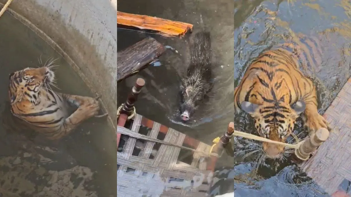 सूअर का पीछा करते हुए कुएं में गिरा बाघ