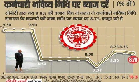 कर्मचारी भविष्य निधि संगठन (ईपीएफओ) ने 2015-16 के लिए 8.8 फीसदी ब्याज दर की सिफारिश की थी जिसे वित्त मंत्रालय ने घटाकर 8.7 फीसदी कर दिया। श्रमिक संगठनों ने इसका विरोध जताया है और दस श्रमिक संगठनों ने शुक्रवार को देशव्यापी विरोध प्रदर्शन की घोषणा की है। राष्ट्रीय स्वयंसेवक संघ समर्थित भारतीय मजदूर संघ भी इस मामले में कल देशव्यापी विरोध प्रदर्शन कर रहा है। सूत्रों के अनुसार वित्त मंत्री ने कोष पर रिटर्न सहित विभिन्न तथ्यों पर विचार करने के बाद ही 2015-16 के लिए ईपीएफ पर 8.7 प्रतिशत ब्याज दर को मंजूरी दी। अधिकारी ने कहा, 8.7 प्रतिशत से पीछे हटने का कोई सवाल नहीं है।