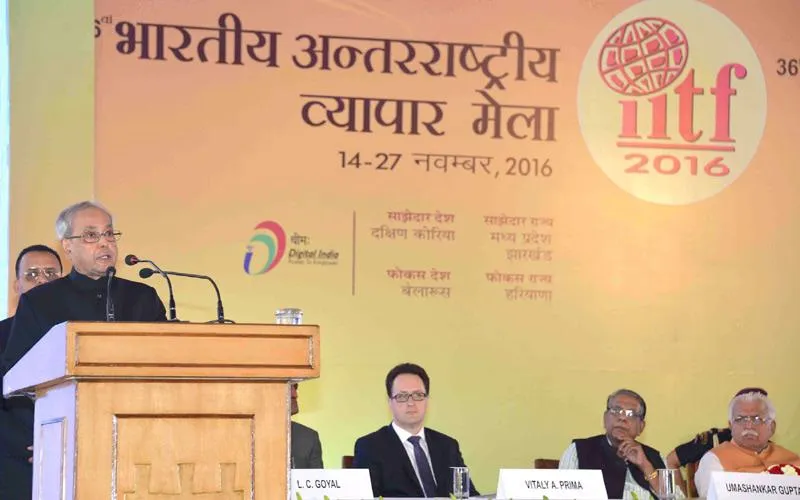 नई दिल्ली। राष्ट्रपति प्रणब मुखर्जी ने सोमवार को दिल्ली के प्रगति मैदान में आयोजित भारत के अंतरराष्ट्रीय व्यापार मेले (ट्रेड फेयर) का उद्घाटन किया। इस वार्षिक ट्रेड फेयर में इस बार 27 देशों की 150 से अधिक कंपनियां भाग ले रही हैं। इस वर्ष मेले का मुख्य विषय डिजिटल इंडिया है और यह 27 नवंबर तक चलेगा।