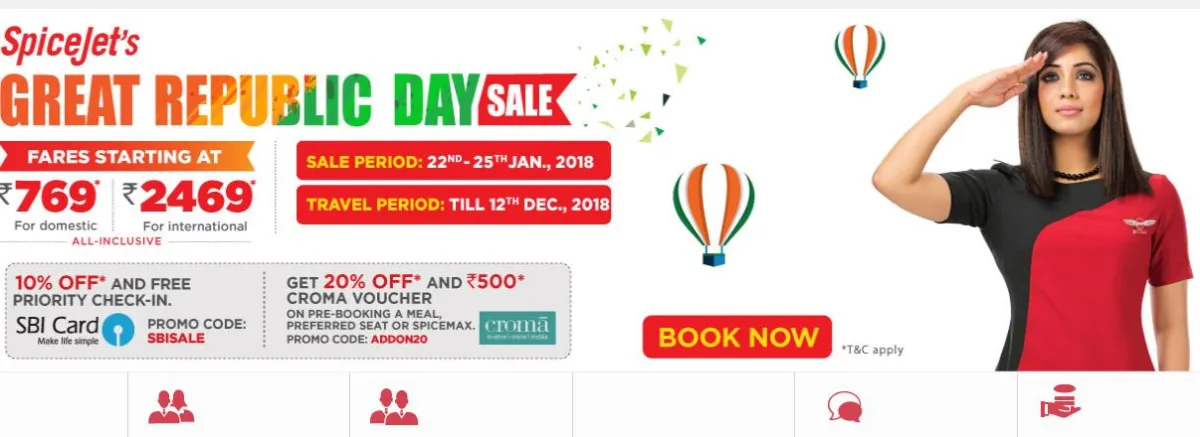 नई दिल्ली। गणतंत्र दिवस के मौके पर निजी एयरलाइन सेवा स्पाइस जेट सस्ती हवाई सेवा का एक ऑफर लेकर आई है। कंपनी की तरफ से Great Republic Day Sale शुरू की गई है जिसके तहत घरेलू उड़ानों पर 769 रुपए में और अंतरराष्ट्रीय उड़ानों के लिए 2469 रुपए में हवाई टिकट बुक किया जा रहा है।
