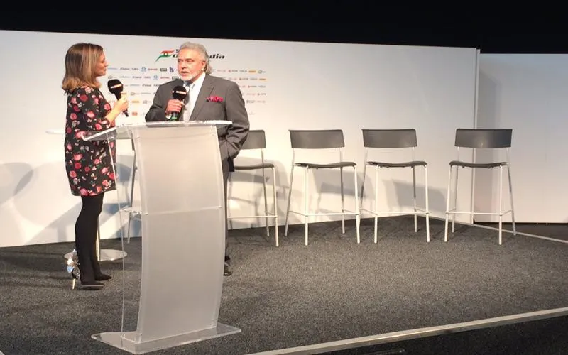 - सूट पहने माल्या को सहारा फॉर्मूला इंडिया के दो ड्राइवरों सर्गियो पेरेज और इस्टेबन ओकन के साथ एक तस्वीर में देखा गया।