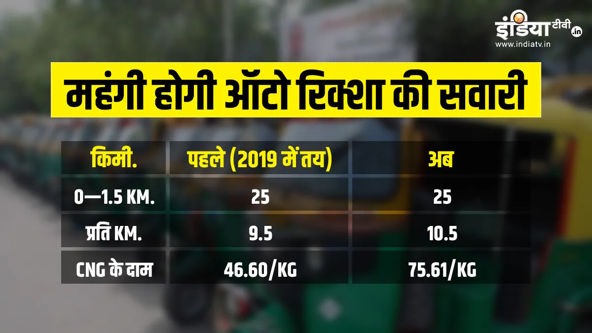 पिछली बार 2019 में ऑटोरिक्शा के किराए में बदलाव किया गया था। उस समय पहले 2 किमी के लिए 25 रुपये के बजाय, मीटर डाउन करने पर डेढ़ किलोमीटर के लिए बेस किराया 25 रुपये किया गया था। बाद के प्रत्येक किलोमीटर के लिए किराया 8 रुपये प्रति किलोमीटर से बढ़ाकर 9.5 रुपये प्रति किलोमीटर कर दिया गया। अब किराया 10.5 रुपये प्रति किलोमीटर हो जाएगा।