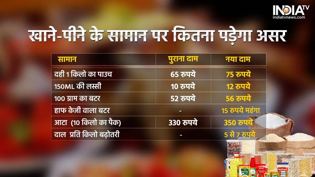 दर में 5 फीसदी की बढ़ोतरी का असर मार्च 2014 की तुलना में दर के हिसाब से हर घर पर पड़ेगा। आटा जिसकी कीमत 20 रुपये प्रति किलो थी, अब 28 रुपये की कीमत हो चुकी है, इसी तरह 400 ग्राम दही की कीमत अब 40 रुपये है, जबकि देसी घी की कीमत लगभग 650 रुपये प्रति किलो तक पहुंच जाएगा, जो कि 2014 के आसपास 350 रुपये प्रति किलो था।